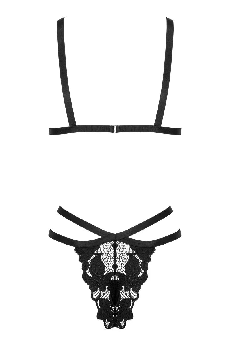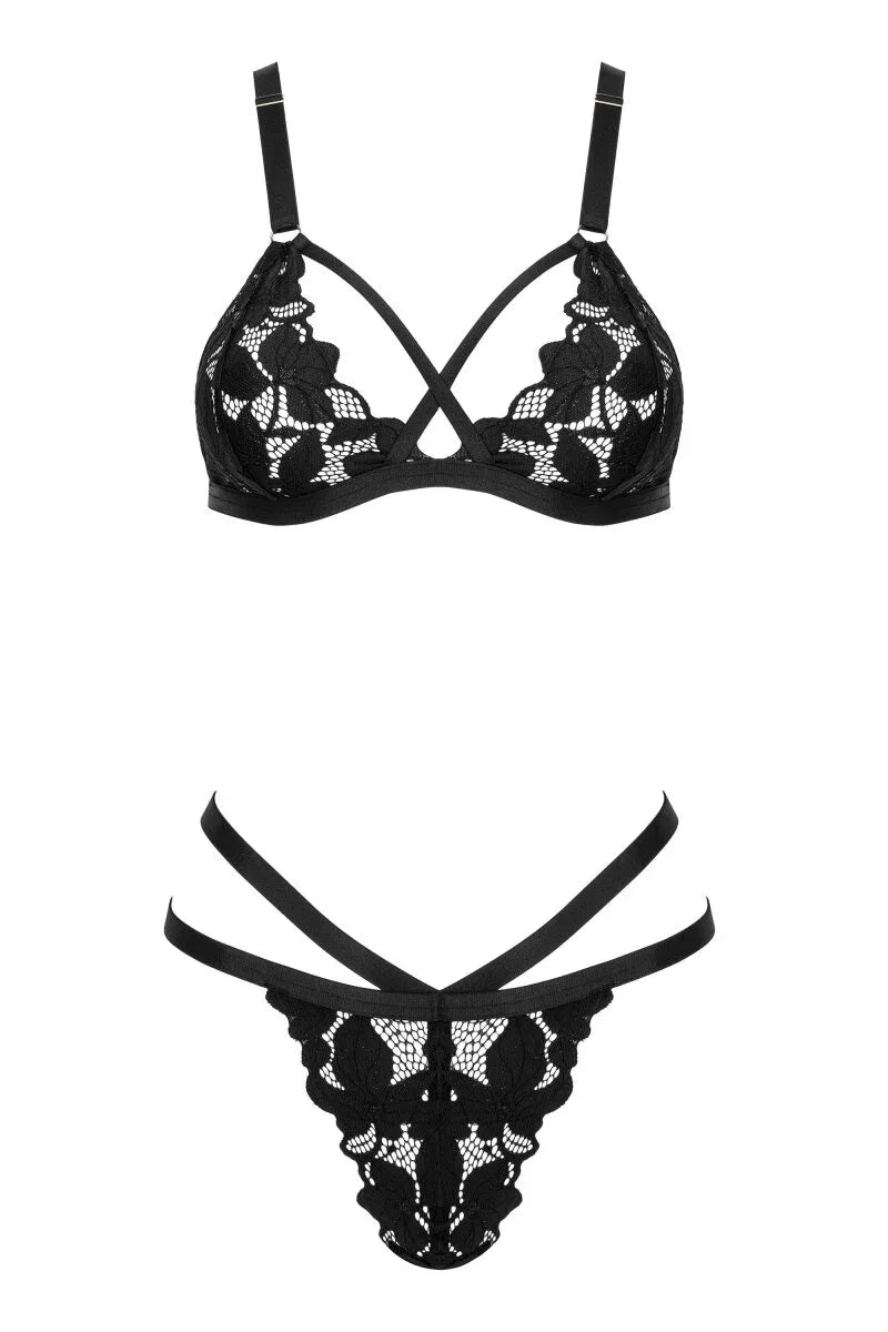 Deze gedurfde maar verfijnde zwarte kanten set speelt met transparantie en moderne banddetails. De triangelbeha is uitgevoerd met fijn bloemkant en een uniek gekruist bandontwerp dat de buste op natuurlijke en verleidelijke wijze omlijst.
