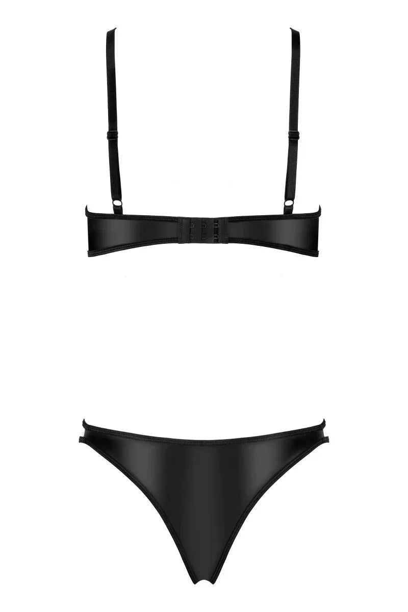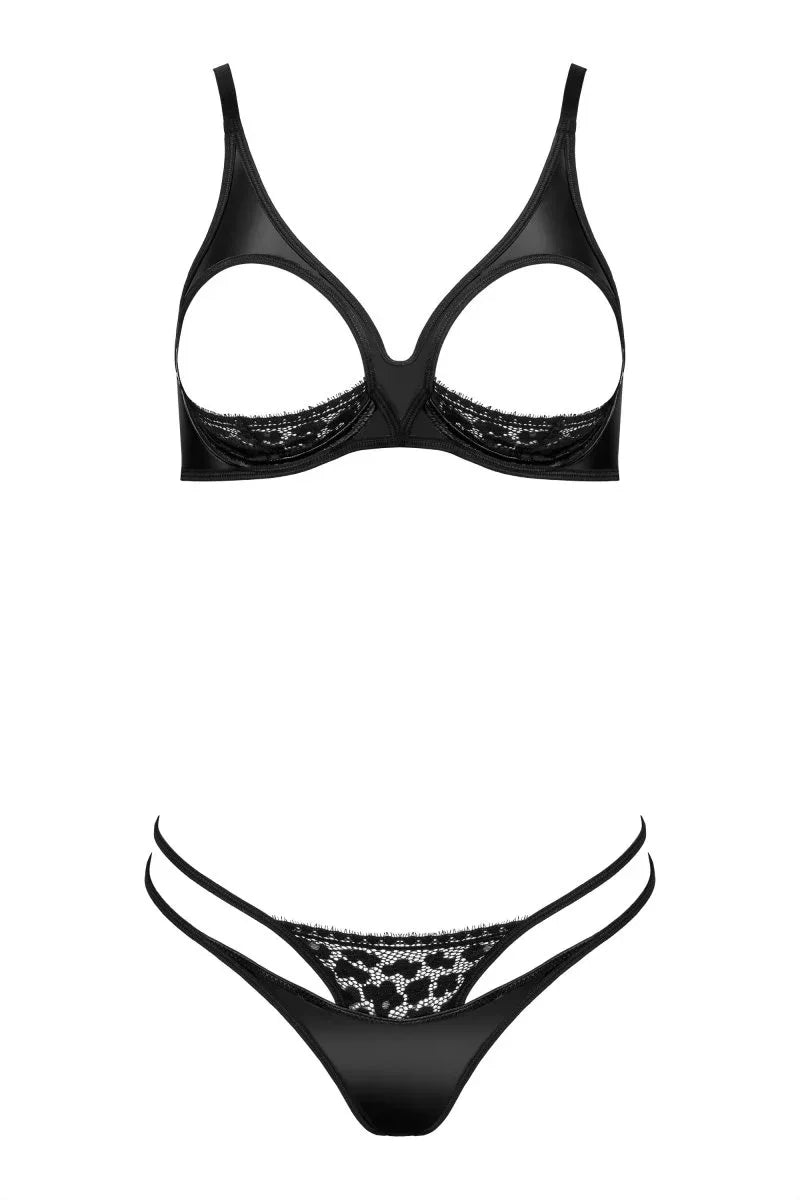 Sensueel, gedurfd en onweerstaanbaar verleidelijk – deze exclusieve 2-delige bh-set van glanzend wetlookmateriaal en verfijnd kant is een musthave voor wie elegantie wil combineren met een vleugje extravagantie. De beha valt op door haar uitdagende ontwerp met open cups die een opvallende en verleidelijke uitstraling creëren. Ingebouwde beugels zorgen voor optimale ondersteuning en een prachtig gevormd silhouet, terwijl de drievoudige haaksluiting aan de achterkant zorgt voor een verstelbare pasvorm. De smalle, verstelbare bandjes bieden extra draagcomfort en een perfecte fit.